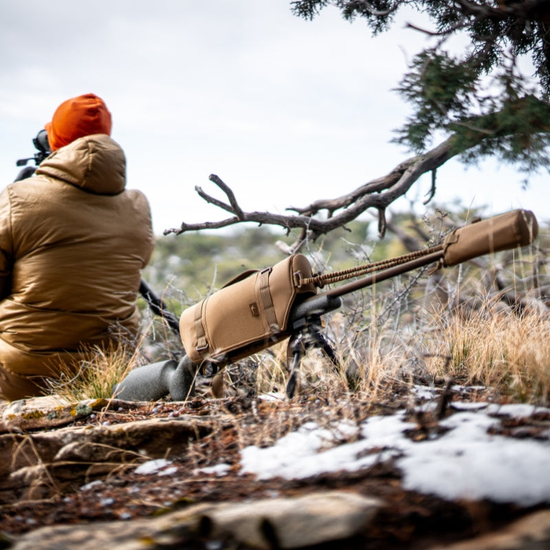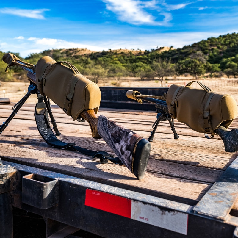 Connect the Padded Scope Cover to the Muzzle Cover via removable, custom tension coil bungees to keep debris out of your barrel.
