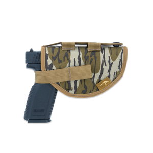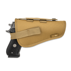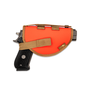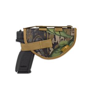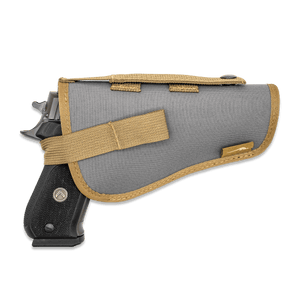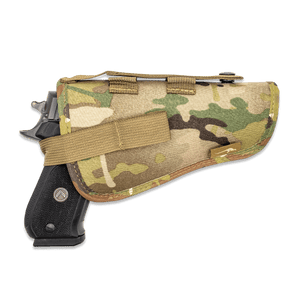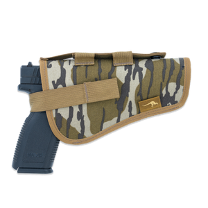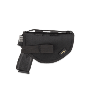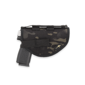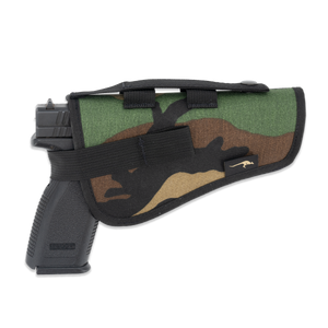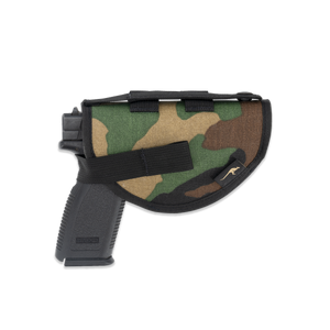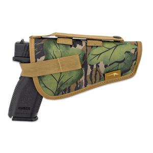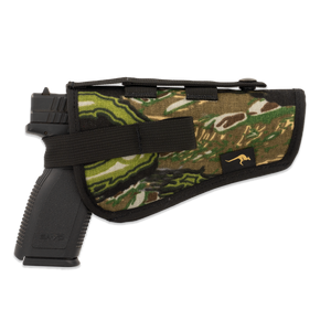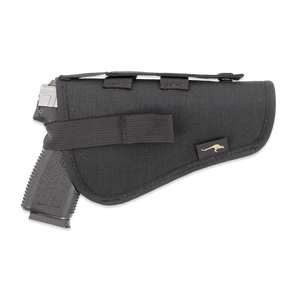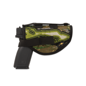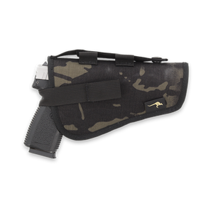 Your firearm stays readily available and secure in a structured/padded holster. Adjustable in size, the holster fits a wide variety of handguns and revolvers. Soft loop velcro material lines the holster's inside, allowing the retention strap to be adjusted for tightness. A ring snap secures the strap and can be released with a quick pull on the release loop. Attaches to the bottom Molle Webbing on Marsupial Gear Chest Packs. Does not interfere with side pouch attachments.